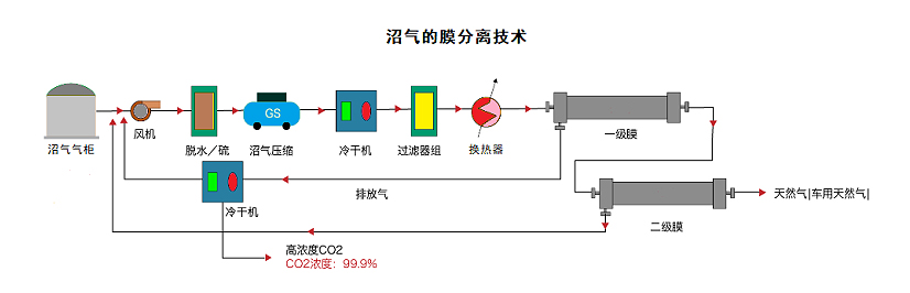 采用先進(jìn)的膜分離技術(shù)把二氧化碳從沼氣或者填埋氣中去除,從而產(chǎn)生高純度的甲烷氣體產(chǎn)品,并具有一定壓力,方便進(jìn)一步的加工。